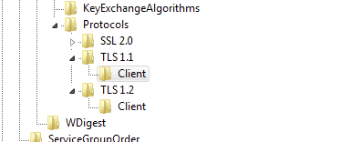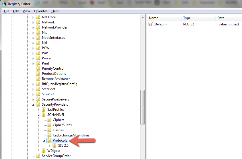 - Browse to HKEY_LOCAL_MACHINESYSTEMCurrentControlSetControlSecurityProvidersSchannelProtocols.