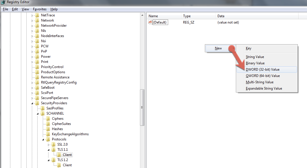 - For the client key under TLS 1.1, right-click on the right pane. Select New > DWORD (32-bit) Value.