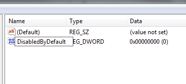 - Create a DWORD value called DisabledByDefault using the default value of 00000000.