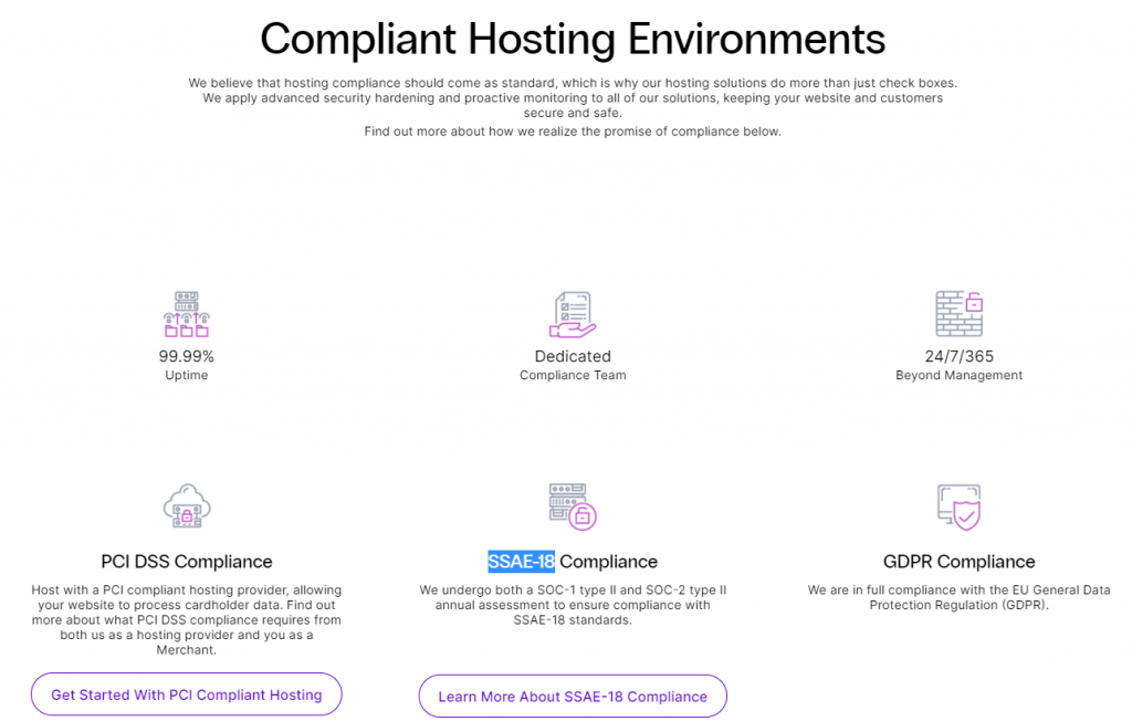 Enterprise hosting plans from Nexcess use servers that comply with several security and data integrity standards. These include the Payment Card Industry Data Security Standards (Level 1 PCI DSS compliance), General Data Protection Regulation (GDPR), and the Statement on Standards for Attestation Engagements No. 18 (SSAE-18 — passing SOC audits 1 and 2).