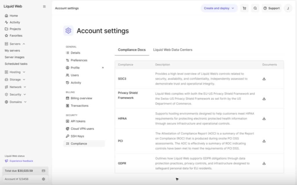 Customers can download compliance certifications for core frameworks, including HIPAA, PCI, GDPR, and SOC3, directly from their account. The dashboard also provides visibility into data center compliance documentation, making it easier to understand how certifications align with specific infrastructure locations.