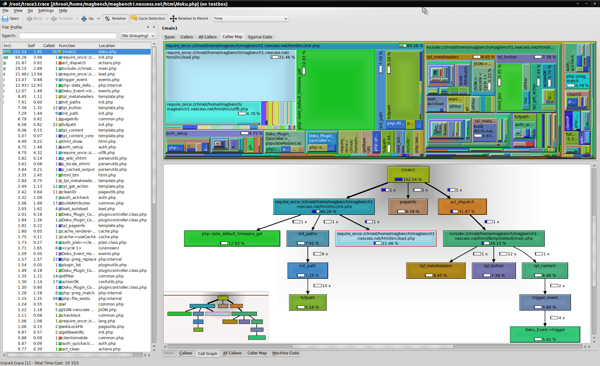 We can see the structure of the program from the graph, and while most of it looks normal, I’d be a bit suspicious as to why php::date_default_timezone_get took so long and consider just making that a constant to speed things up (by almost 13% !). This is, of course, with zero real wiki content on the page, so things would change as the content changes, but it’s still an very valuable tool for going deep into why an application is slow.