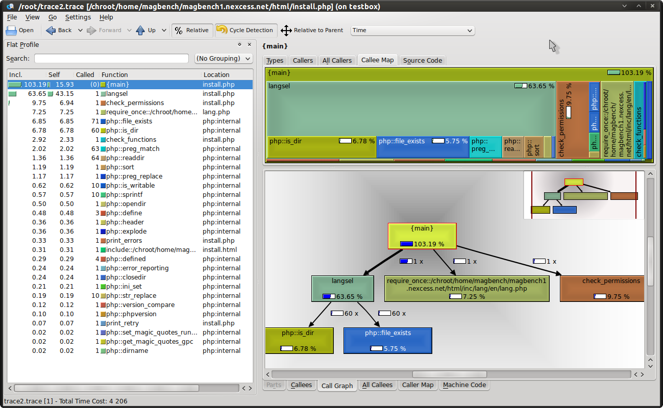 As you can see, test.php took up 100% of the time and there were no callers or calls to external scripts / functions / methods.