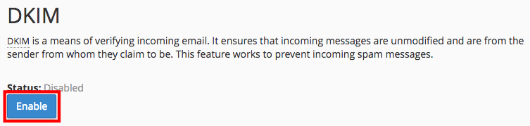 3. On the Email Authentication page, you’ll see two different methods: DKIM and SPF. We recommend using both, but this walkthrough will only cover DKIM. We have a separate article on SPF records. In the DKIM section, click Enable if DKIM is disabled.