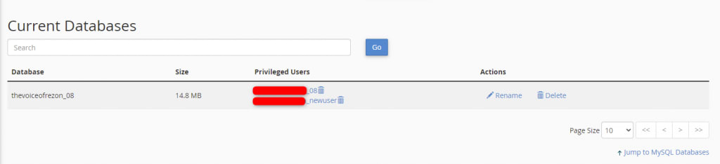 6. To see the user assigned to the database, navigate to the MySQL Databases page under Current Databases.