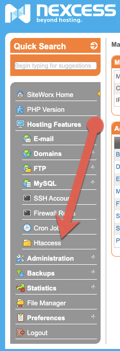 How Nexcess clients on physical (non-cloud) accounts can create an .htaccess file for the entire domain as well as a specific directory.
