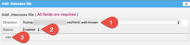 - select the directory in which to create the .htaccess file from the Directory drop-down menu (1). If you would like the new .htaccess file to be enabled immediately upon creation, select Enabled from the Status drop-down menu (2). Click Add when ready.