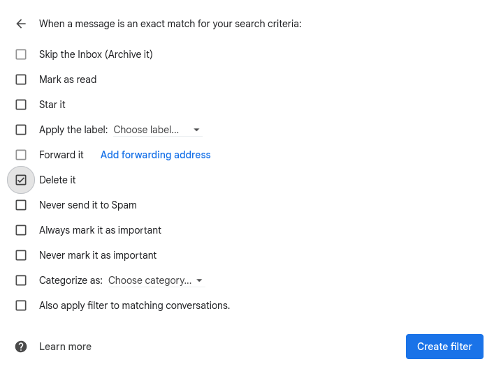 Click the checkbox next to Delete it from the list of actions and click Create filter.