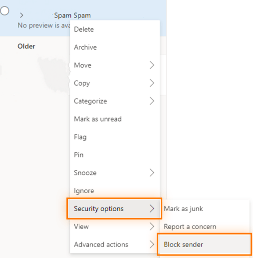 Launch Outlook and right-click on the spam email. Hover over Security options, then select Mark as junk.