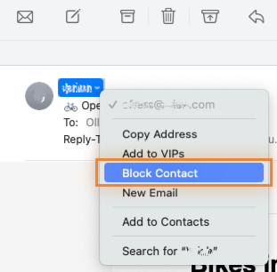 Launch the Mail App, then pick a message from the sender you want to block. Select the down arrow next to the sender’s name in the message header and click Block Contact.