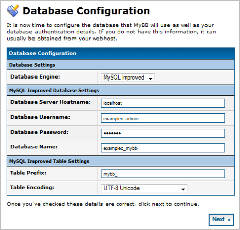 ATTENTION: When typing database information, be sure to enter the full name of the database, include the first eight characters of your domain name prefixed to the database/database username, for example examplec_myBB. - Type the database information, and then click Next. If the script is able to connect to the specified database, it displays a message indicating that it will be created.