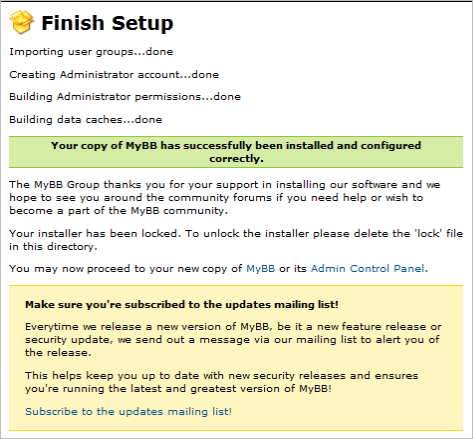 - Delete the /install directory. To start configuring your new bulletin board, use the log in information that you created in Steps 10-11.