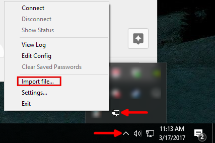 - After installation, near the lower right corner of your screen, click the arrow, then right-click on the OpenVPN GUI icon and click Import File.