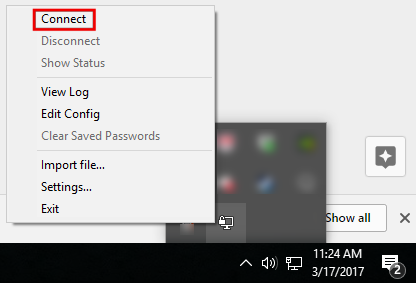 As in Step 4, select the OpenVPN GUI icon, then click Connect. To disconnect, click Disconnect from this menu.
