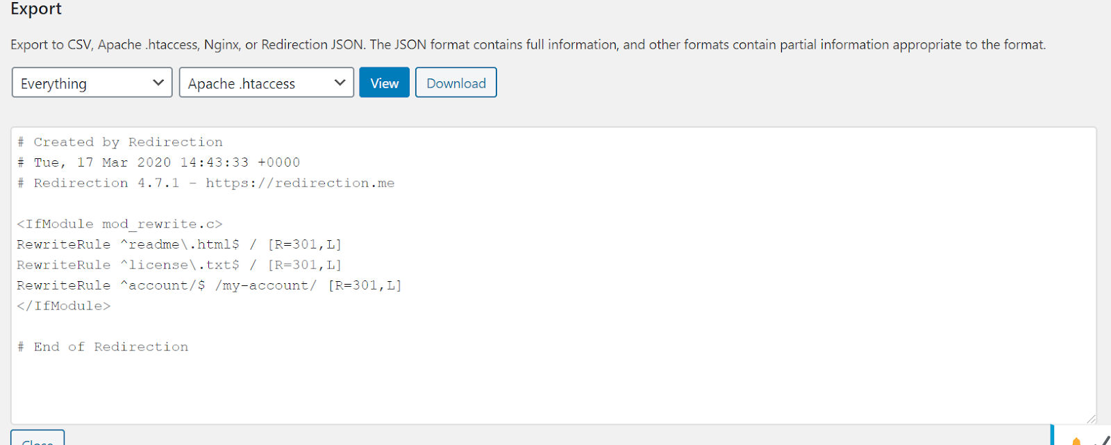 RewriteRule ^(.*)$ https://%{HTTP_HOST}%{REQUEST_URI} [L,R=301,NE] If you are using a redirection plugin on your site like Redirection. Then the plugin has a feature to be able to export to .htaccess. You can create rewrite rules in the plugin and then export them.