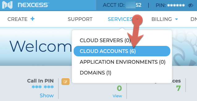 1. Log in to the Client Portal. From the home page, click Services > Cloud Accounts.