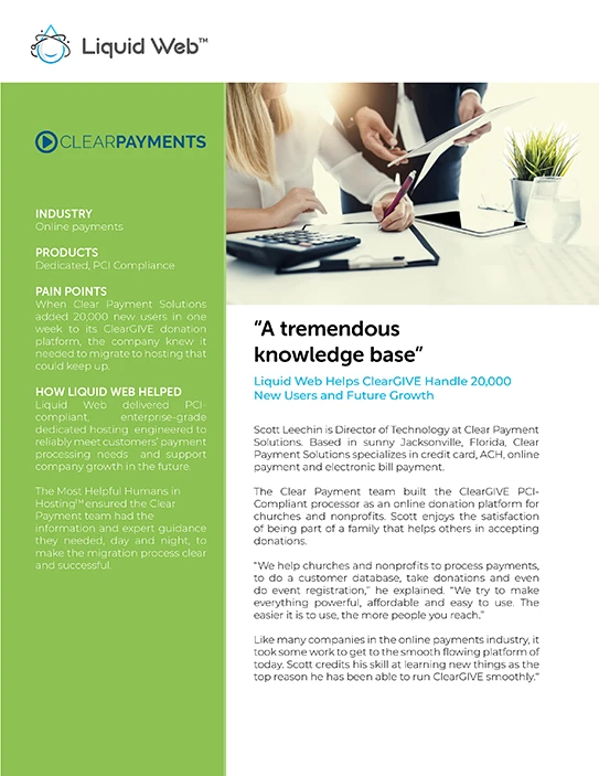 When ClearGIVE added 20,000 new users in one week, their old hosting provider couldn’t keep up. Liquid Web delivered PCI-compliant, enterprise-grade dedicated hosting designed for reliability and growth.