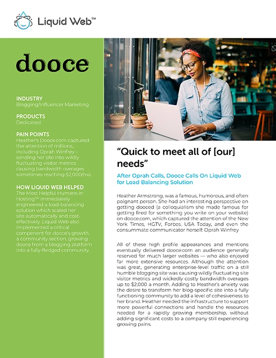 After appearing on Oprah, Dooce.com’s bandwidth overages reached $2K/mo. Liquid Web engineered a load balancing solution for automatic, cost-effective scaling and helped Dooce become an online community.