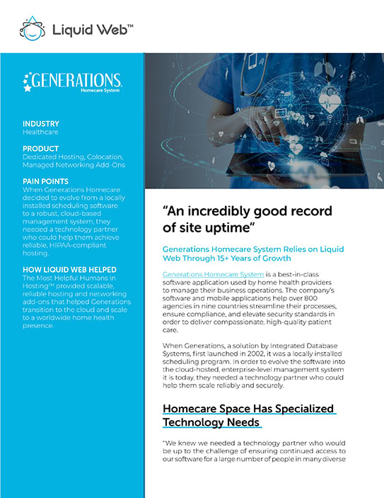 When Generations, a solution by Integrated Database Systems, first launched in 2002, it was a locally installed scheduling program. In order to evolve the software into the cloud-hosted, enterprise-level management system it is today, they needed a HIPAA hosting partner who could help them scale reliably and securely.