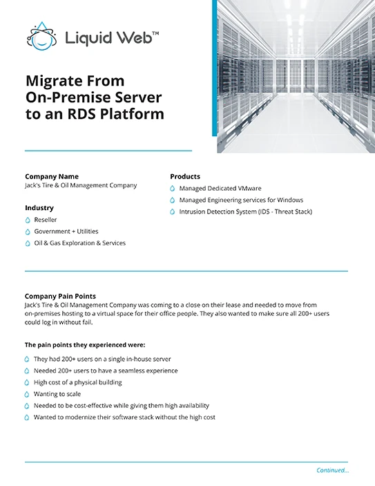 Liquid Web successfully transitioned Jack’s Tire & Oil Management Company from on-premises hosting to a VMware private cloud with minimal disruption. The move resulted in cost savings, stability, and the ability for their massive audience of 200+ users to login without difficulty. In addition, this solution demonstrates the power of Remote Desktop Services (RDS) in tackling complex problems and maximizing resources.