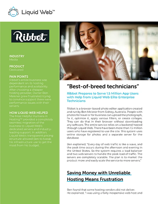 Ribbet grew frustrated with its cheap hosting provider’s performance issues and bad support. Liquid Web provided a seamless migration to its dedicated servers, delivering performance and transparent pricing.
