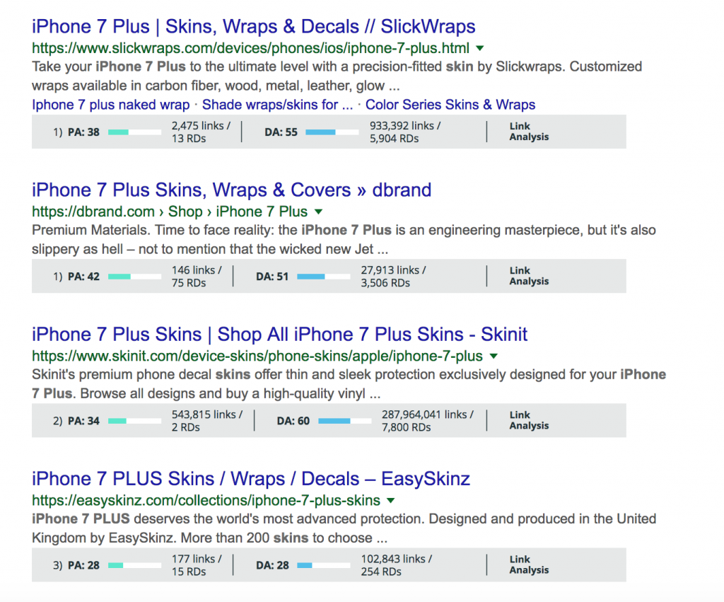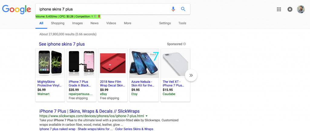 Let’s use the search term [iphone skins 7 plus], which according to Keywords Everywhere (a free Chrome extension) has 5,400 searches per month:
