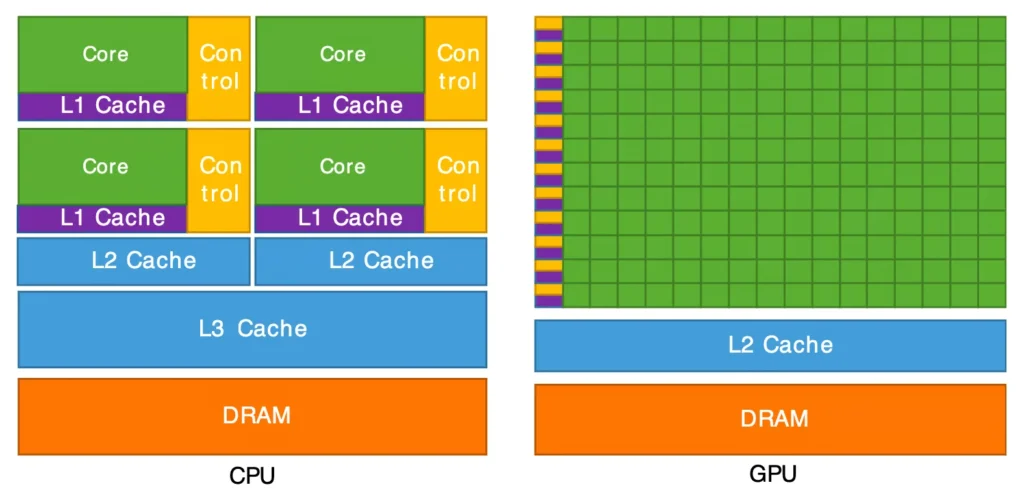 | Core architecture | Thousands of smaller cores optimized for parallel processing | Fewer, larger cores optimized for sequential processing |