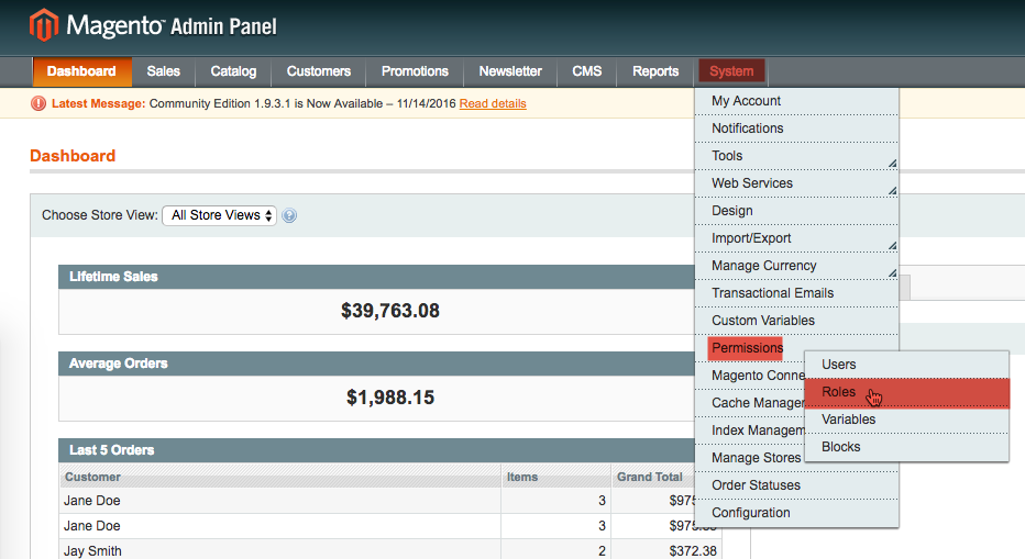 - From the Admin Panel, select System > Permissions > Roles.