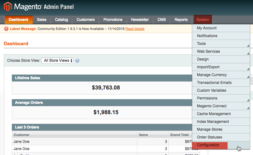 - From the Admin Panel, select System > Configuration.