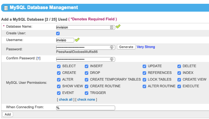4. Fill the Username field, though we recommend “invision.” Fill the Password and Confirm Password fields, or click Generate. Note this information for use in Step 5. Verify all MySQL User Permissions are selected, then click Add when ready.