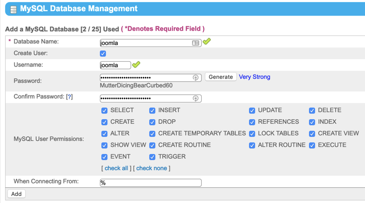 - Fill the Username field, though we recommend “joomla.” Fill the Password and Confirm Password fields, or click Generate. Note this information for use in Step 5. Verify all MySQLUserPermissions are selected, then click Add when ready.