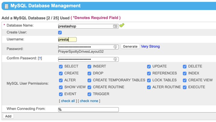 - Fill the Username field, though we recommend “presta.” Fill the Password and Confirm Password fields, or click Generate. Note this information for use in Step 5. Verify all MySQL User Permissions are selected, then click Add when ready.