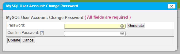 4. In the Password field, enter the password, or click Generate to have SiteWorx create one for you. If you created your own password, enter it again in the Confirm Password field. Click Update when ready.