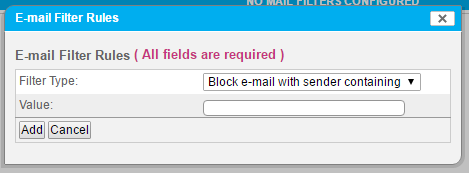 - The Email Filter Rules panel appears. In the Filter Type drop-down list, select the Block e-mail with sender containing if it is not already selected.