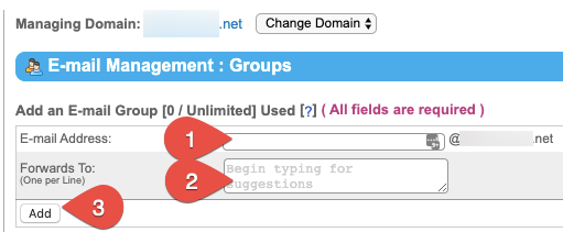 - In the Email Address field (1), enter the name for your email group. An email sent to that group will be forwarded to all email addresses listed in the Forwards To field. In the Forwards To field (2) , enter the target email addresses one line at a time, then click Add (3).