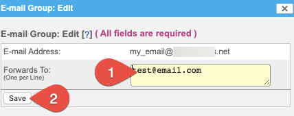 - On the Email Group: Edit dialog field, click inside the Forwards To account and add or remove email addresses as needed. Click Save when done.