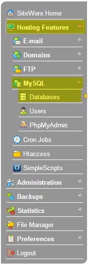 - In the SiteWorx main menu, click Hosting Features > MySQL > Databases.