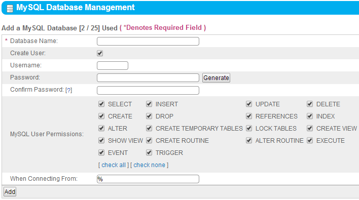 - Verify all of the MySQL User Permissions check boxes are selected and click Add.