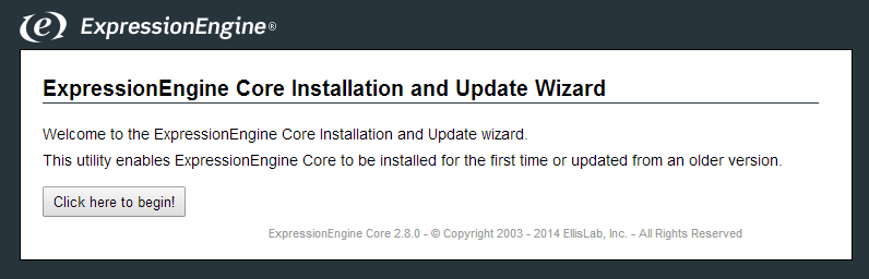- The ExpressionEngine Installation and Update Wizard page will appear; click Click here to begin!.
