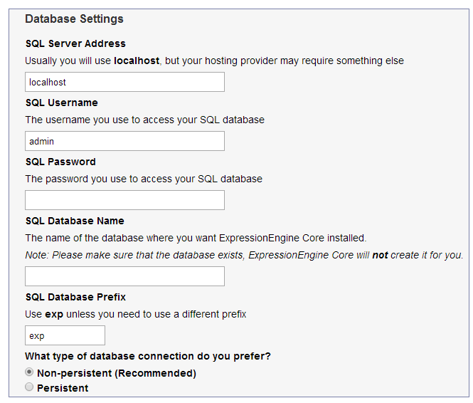 - The “Database Settings” window displays. Enter the database credentials created earlier.