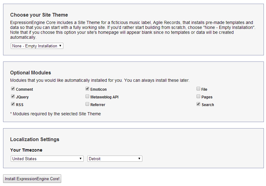- The “Optional Modules” section allows you to install various modules that are not included with ExpressionEngine. You may now choose to include any or all of those modules.