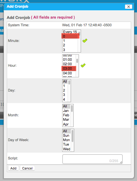 4. In the Add Cronjob panel, designate your preferred time for the cron job to run. For this example, set the Minute to 0, and the Hour to 03:00. Note the times in the hour list are reflective of a 24-hour clock.