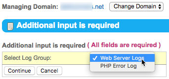 - If necessary, select the desired log group from the Select Log Group drop-down list, then click Continue.
