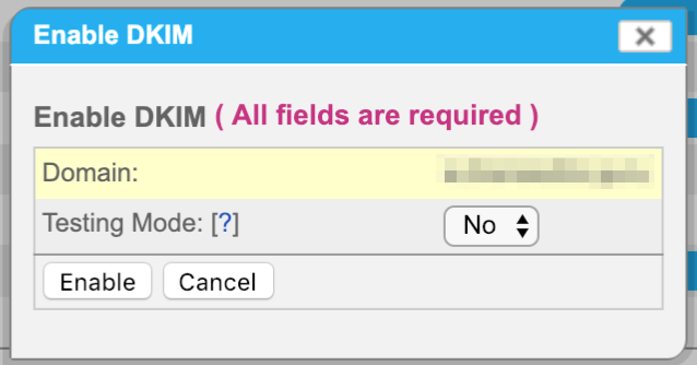 - Select Yes or No to specify whether DKIM will be tested for your domain. Unverified email will not be treated any differently from verified email NOTE: If setting up DKIM for an active domain, select No.