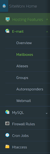 6. From the SiteWorx Home main menu, click Hosting Features > E-mail > Mailboxes.