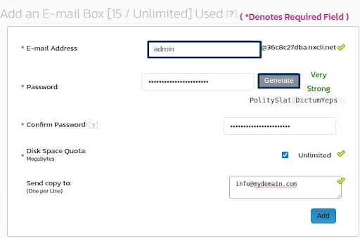 9. Note: Your domain name is automatically added next to the E-mail Address field on the right side.