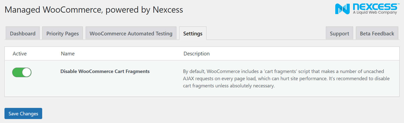 If you notice any issues being caused by disabling cart fragments due to the plugins for WooCommerce being used or the active theme on the site then you can disable the feature and then test on a staging site. But keeping cart fragments disabled on your WooCommerce site where possible is recommended for optimal performance.
