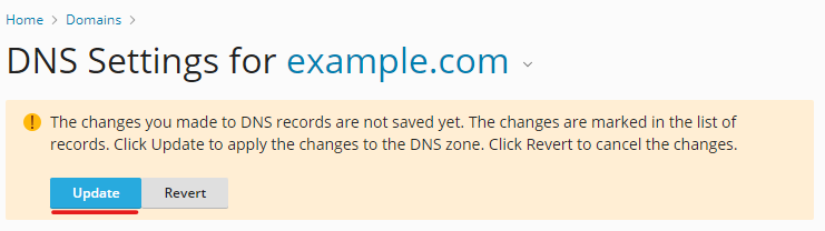 - Click the Update button in order to publish the changes that have been made to all DNS records for this domain
