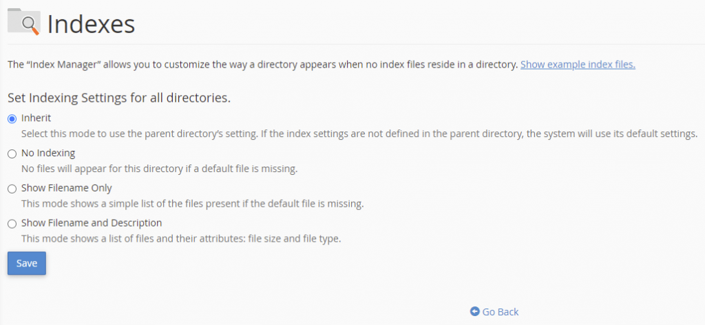 Displaying your directory contents can cause security issues. Use the Index Manager in cPanel to define how your server shows a specific directory’s index to a visitor or disable the feature altogether.