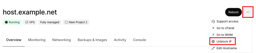 - Click the three dot menu to the right of the server name and click Unblock IP from the drop down menu.